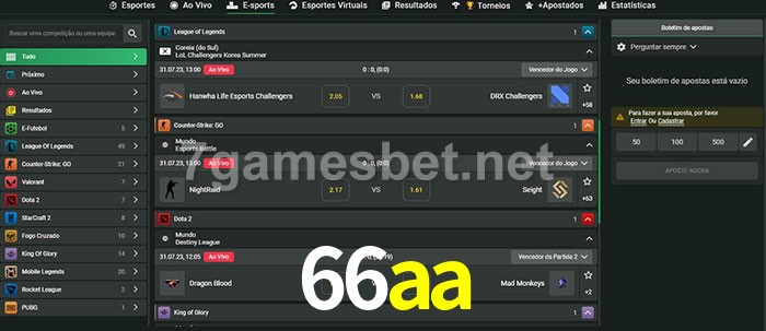 O 66aa oferece uma grande seleção de opções de apostas em e-sports com probabilidades competitivas